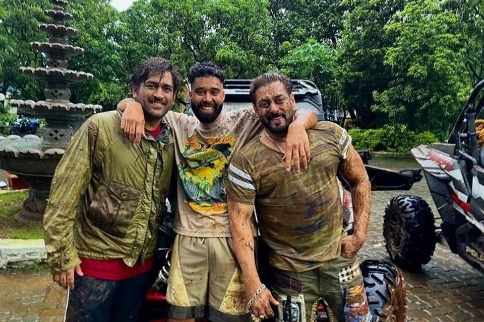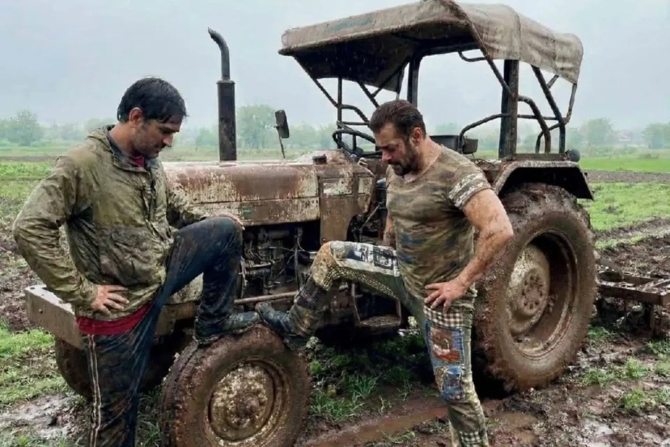 இந்தப் புகைப்படத்தில் டிராக்டர் ஓட்டிய பின்னர் சல்மான்கானும் டோனியும் சேறும் சகதியுமாகக் காணப்படுகிறார்கள். அதில், இவர்கள் இருவருடன் பாடகர் எபி தில்லானும் உள்ளார்.