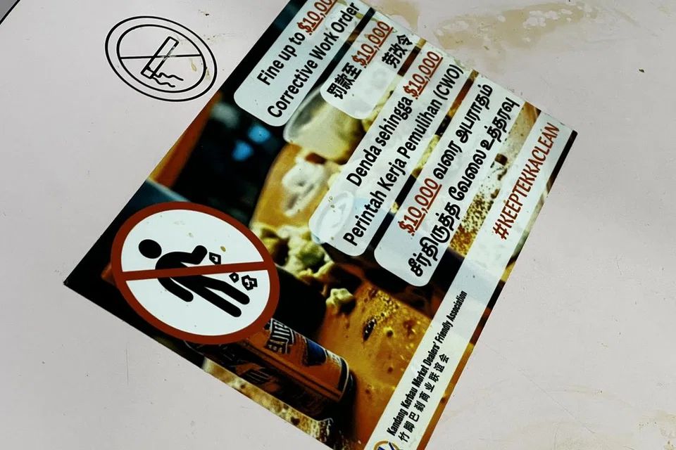 [ο] ‘குப்பை போடுவோருக்கு $10,000 வரை அபராதம், சீர்திருத்த வேலை உத்தரவு’ என மேசைகளில் ஒட்டப்பட்டுள்ளது.