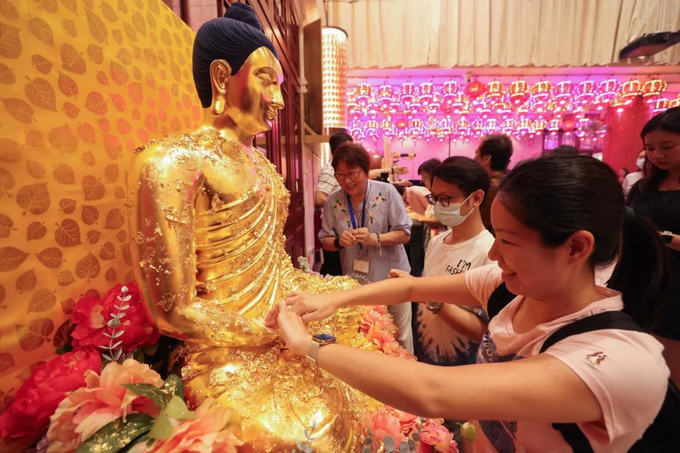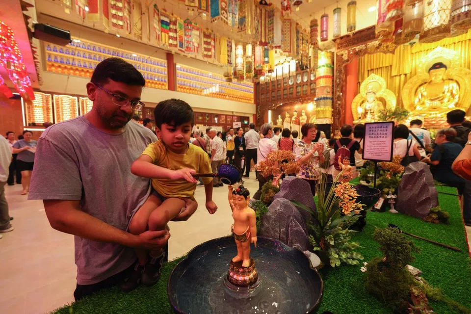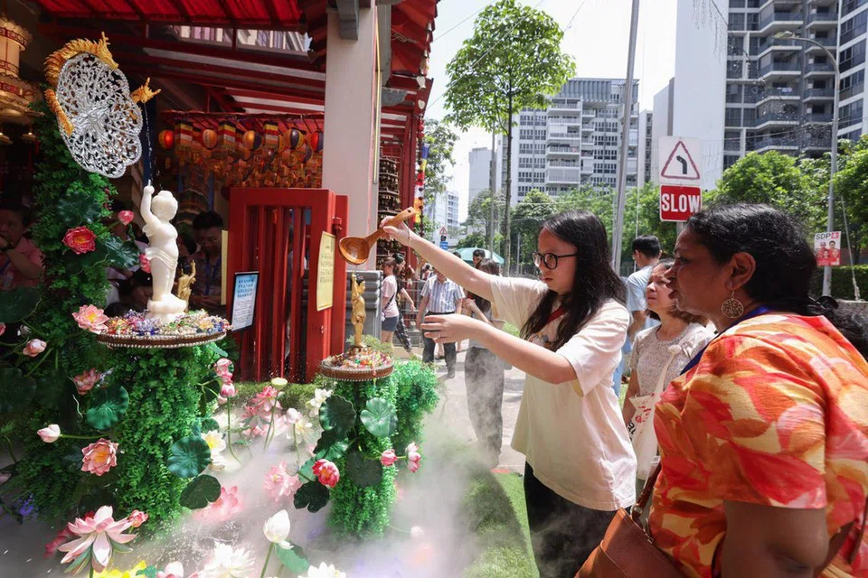 தாமரைப்பூ வடிவங்களில் விளக்குகள், புத்தர் சிலைகளுக்குமுன் மண்டியிட்டு வழிபாடுகளில் ஈடுபடுவது என சிங்கப்பூரின் பல்லினக் கலாசாரத்தைப் பறைசாற்றும் வண்ணம் குடியிருப்பு வட்டாரத்தில் விசாக தின நிகழ்வு அமைந்தது.