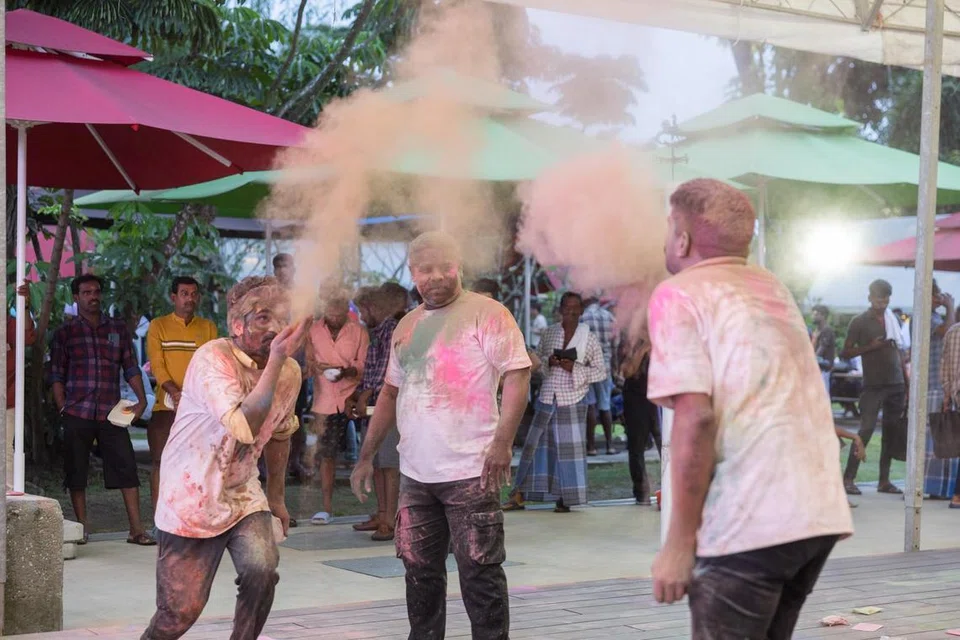 வெள்ளைச் சட்டைகளை அணிந்து வந்த அவர்கள், வண்ணப் பொடிகளை ஒருவர்மீது ஒருவர் தெளித்து விளையாடினர். தண்ணீர் பலூன் விளையாட்டுகளிலும் அவர்கள் பங்கேற்று களிப்புற்றனர்.