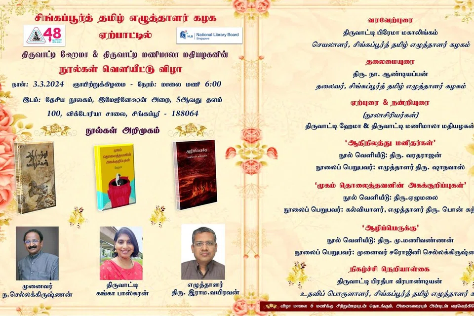 சிங்கப்பூர்த் தமிழ் எழுத்தாளர் கழக ஏற்பாட்டில், கழகத்தின் பொருளாளர் மணிமாலா மதியழகன், செயலவை உறுப்பினர் ஹேமா ஆகியோரின் மூன்று நூல்களின் வெளியீடு மார்ச் 3ஆம் தேதி, ஞாயிற்றுக்கிழமை மாலை 6 மணியளவில் தேசிய நூலகத்தின் 5ஆவது தளத்திலுள்ள இமேஜினேஷன் அறையில் நடைபெறவுள்ளது.