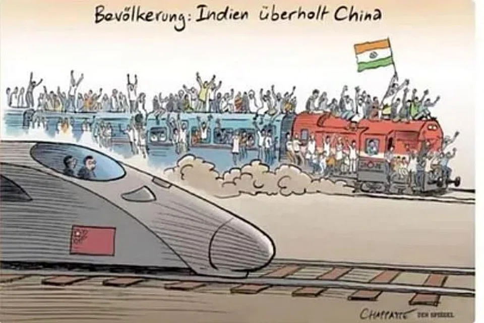 மக்கள் தொகையில் இந்தியா சீனாவை விஞ்சப்போவதாக சில நாள்களாகத் தகவல்கள் வெளியாகி வருகின்றன. அதைக் குறிக்கும் நோக்கில் சஞ்சிகை சித்திரம் வெளியிட்டது.
