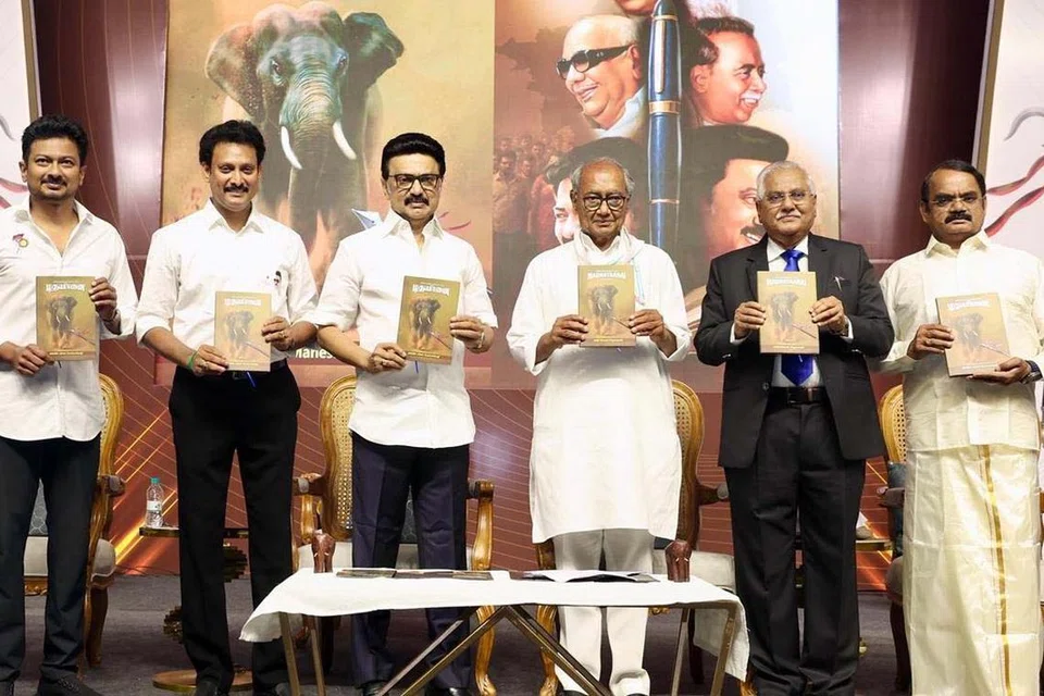 பள்ளிக் கல்வித்துறை அமைச்சர் அன்பில் மகேஸ் எழுதிய ‘தேசிய கல்விக்கொள்கை 2020 எனும் மதயானை’ என்னும் நூலை அண்ணா நூற்றாண்டு நூலக வளாகத்தில் மே 17ஆம் தேதி முதல்வர் மு.க.ஸ்டாலின் வெளியிட்டார். அந்நிகழ்ச்சியில், துணை முதல்வர் உதயநிதி, இஸ்ரோ முன்னாள் விஞ்ஞானி மயில்சாமி அண்ணாதுரை, மத்திய பிரதேச முன்னாள் முதல்வர் திக் விஜய்சிங், உச்​ச நீ​தி​மன்ற முன்னாள் நீதிபதி வெ.கோபால கவுடா. - படம்: இந்து தமிழ் திசை