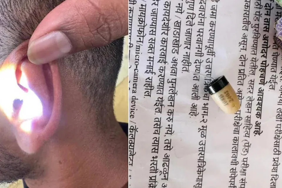 அந்தத் தேர்வை எழுதிய 22 வயது இளையர் தமது காதில் ஒரு சிறிய மாத்திரை அளவுள்ள ‘ப்ளூ டூத்’ சாதனத்தை வைத்து இருந்தார். வெளியில் இருந்து யாரோ ஒருவர் கேள்விக்கான விடைகளைச் சொல்லச் சொல்ல அவர் விடைத்தாளில் எழுதிக் கொண்டு இருந்தார்.