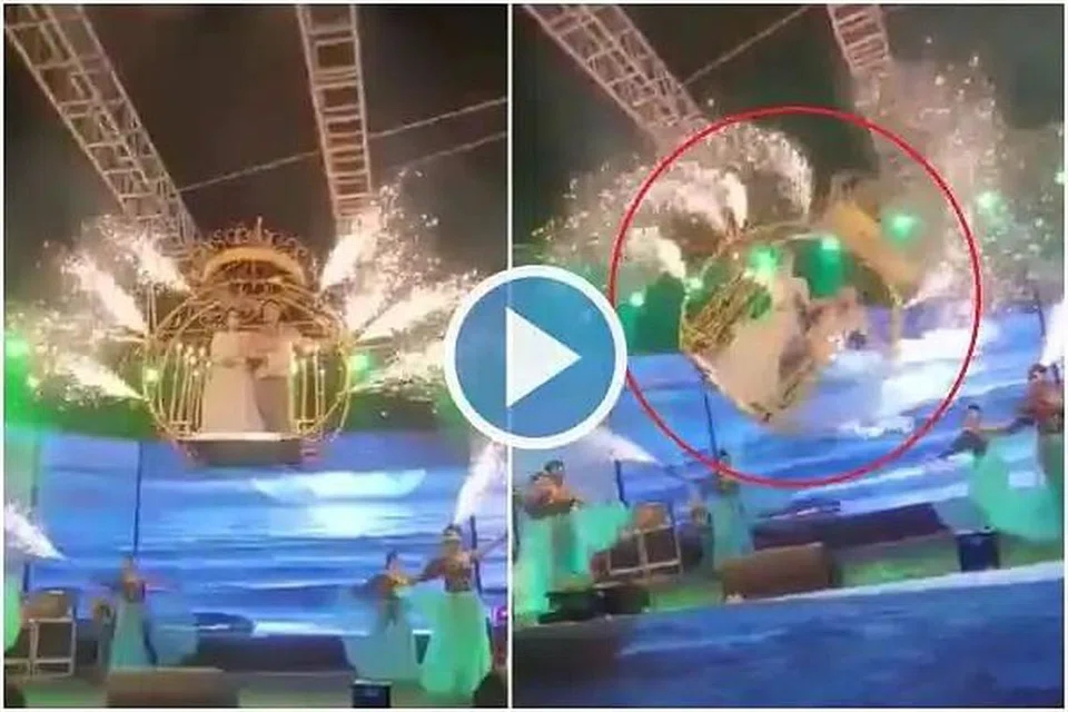 மெல்ல மெல்ல உயரே சென்ற ஊஞ்சல் திடீரென அறுந்துவிழ, கிட்டத்தட்ட 12 அடி உயரத்தில் இருந்து மணமக்கள் கீழே விழுந்தனர். நல்ல வேளையாக, அவர்கள் பெரிதாகக் காயம் அடையவில்லை.