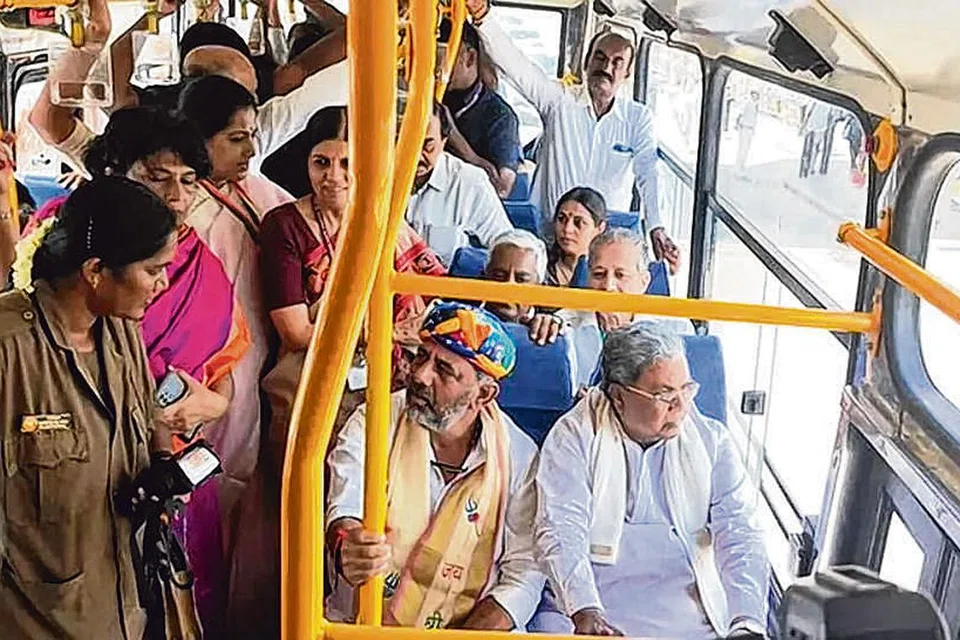 தேர்தல் வாக்குறுதியில் அறிவித்தபடி அரசுப் பேருந்து களில் பெண்கள் இலவசப் பயணம் மேற்கொள்ளும் 'சக்தி' திட்டம் கர்நாடக மாநிலம் முழுவதும் நேற்று (ஞாயிற்றுக்கிழமை) தொடங்கி வைக்கப்பட்டது. திட்டத்தைத் தொடங்கி வைத்த முதல்வர் சித்தராமையாவுடன் துணை முதல்வர் டி.கே.சிவக்குமாரும் பயணிகளுடன் அமர்ந்து பேருந்தில் பயணம் செய்தனர். படம்: ஊடகம்