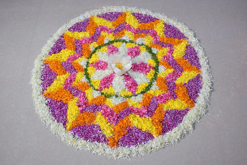பண்டிகையை வரவேற்கும் விதமாக வீடுகளின் முன்பு அத்தப்பூ கோலங்கள் வரையப்பட்டிருந்தன.