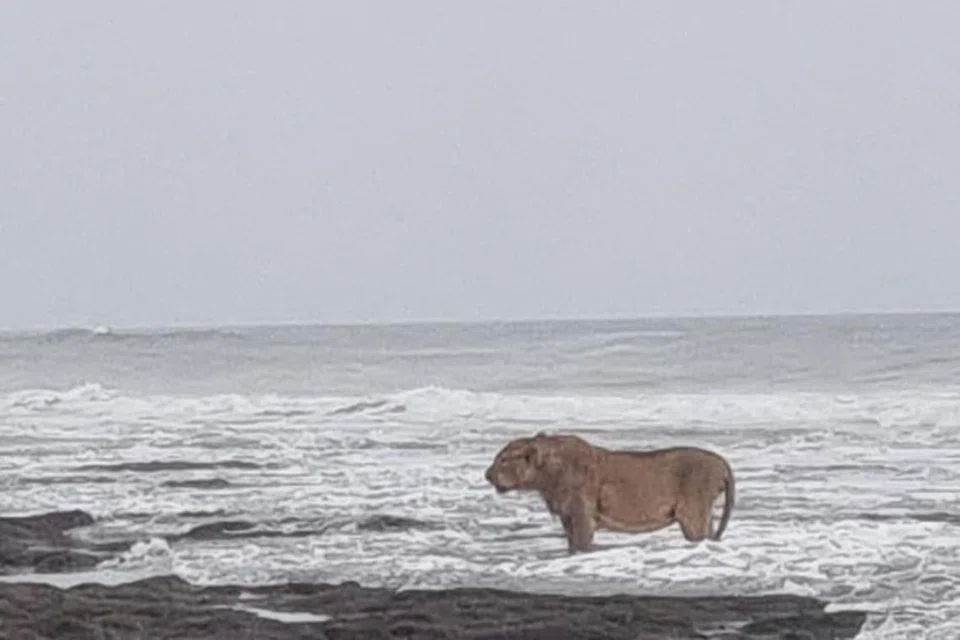 இந்தியாவின் குஜராத் மாநிலம், ஜுனாகத் நகரில் அரபிக்கடலோரத்தில் ஆசிய சிங்கம் ஒன்று நிற்பதைக் காட்டும் புகைப்படம் சமூக ஊடகங்களில் பரவலாகியது.