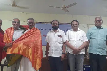 பேராசிரியர் பழநி அரங்கசாமிக்கும் நூலாசிரியருக்கும் சேர்த்து பொன்னாடை போர்த்தினார் கவிஞர் பிச்சினிக்காடு இளங்கோ. திரு மணிமாறன், திரு இரா.செழியன், கவிஞர் திருநாவுக்கரசு, பேராசிரியர் க.அன்பழகன் ஆகியோர் உடன் உள்ளனர்.