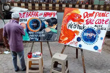 மனித மெட்டா நிமோ வைரஸ் (HMPV) தொற்று இந்தியாவில் பதிவானதைத் தொடர்ந்து பதற்றம் ஏற்பட்டுள்ளது. லால்பாக், குருகுல் ஸ்கூல் ஆஃப் ஆர்ட்டின் ஆசிரியர் “பதற்றம் வேண்டாம்” என்ற பதாகைகளை வரைந்துள்ளார்.