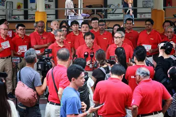 புளோக் 257 பங்கிட் சாலை அருகே உள்ள திறந்தவெளியில் நடைபெற்ற செய்தியாளர் சந்திப்பில் பேசும் சிங்கப்பூர் ஜனநாயகக் கட்சியின் தலைமைச் செயலாளர் சீ சூன் ஜுவான் (நடுவில்).