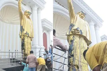 சேலம்: முன்னாள் முதல்வர் கருணாநிதியின் முழு உருவச் சிலை மீது கறுப்புச் சாயம் வீசப்பட்டதால்