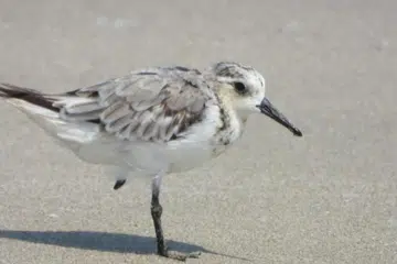 கல்பா கடற்கரையில் ஒற்றைக் காலுடன் அங்குமிங்கும் ஓடி இரை தேடிய வெள்ளை உள்ளான் (சேண்டர்லிங்) பறவை,