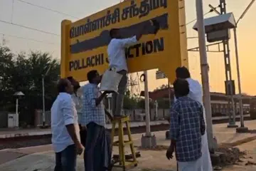 மத்திய அரசின் இந்தித் திணிப்பைக் கண்டிக்கும் வகையில் பொள்ளாச்சி ரயில் நிலையத்தில் எழுதப்பட்டுள்ள இந்தி எழுத்துகளைக் கறுப்பு மைப்பூசி அழிக்கும் மொழி ஆர்வலர்கள்.
