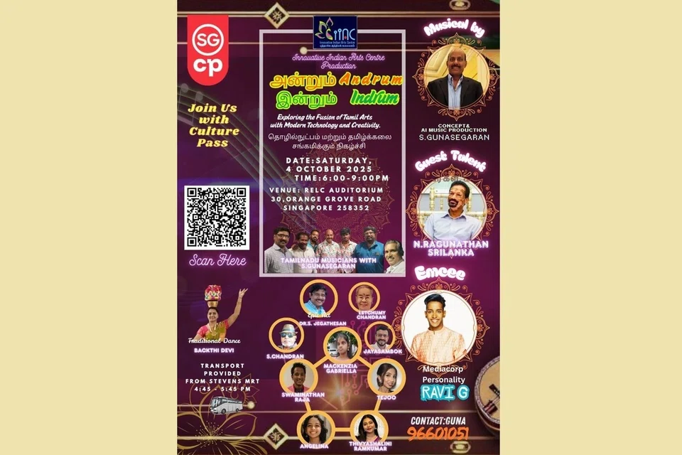 புத்தாக்க இந்தியக் கலையகம் சனிக்கிழமை (அக்டோபர் 4) இரவு 6 முதல் 9 மணிவரை ஆர்இஎல்சி (RELC) அரங்கில் ஏற்பாடு செய்திருக்கும் ‘அன்றும் இன்றும்’ நிகழ்ச்சியில் தமிழ்க் கலைகளும் தொழில்நுட்பமும் ஒன்றுகலந்திடவுள்ளன.