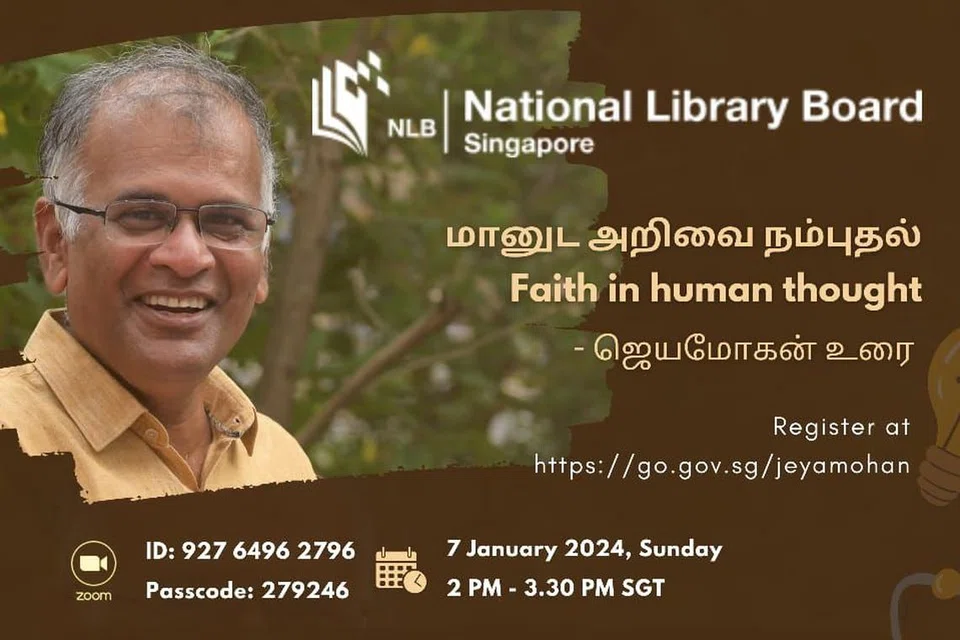 தேசிய நூலக வாரியத்தின் ஏற்பாட்டில், ஞாயிறு ஜனவரி 7ஆம் தேதி மாலை 2 முதல் 3.30 மணி வரை ‘மானுட அறிவை நம்புதல்’ எனும் தலைப்பில் புகழ்பெற்ற தமிழ் எழுத்தாளர் ஜெயமோகன் இணையம் வழியாக உரையாற்றினார்.