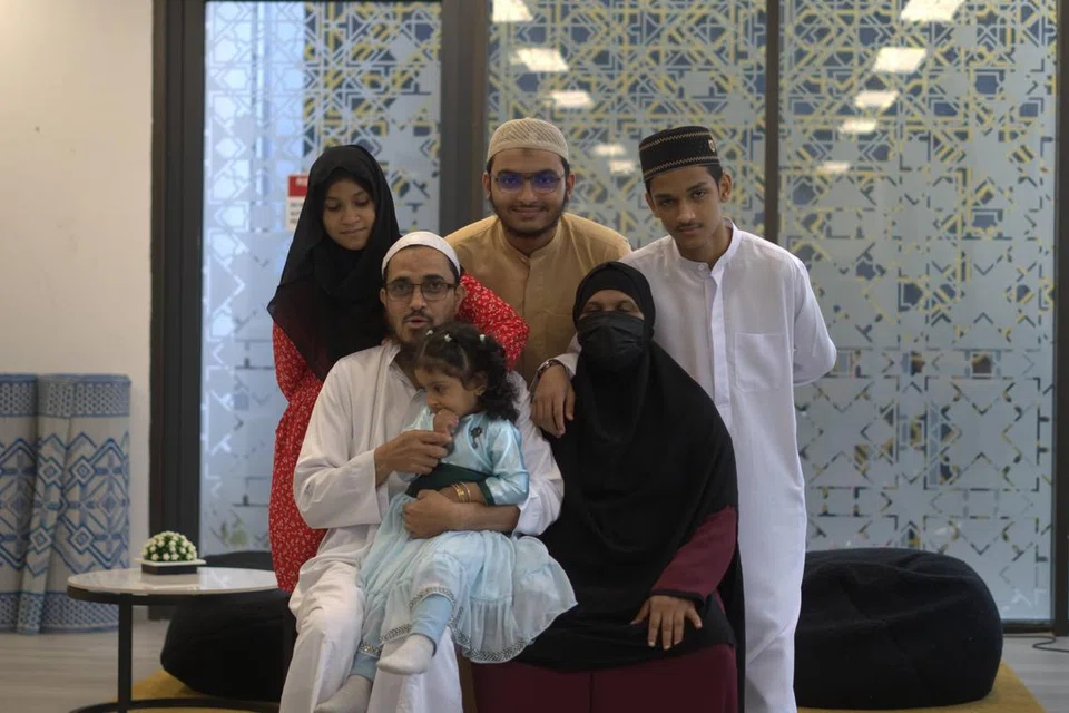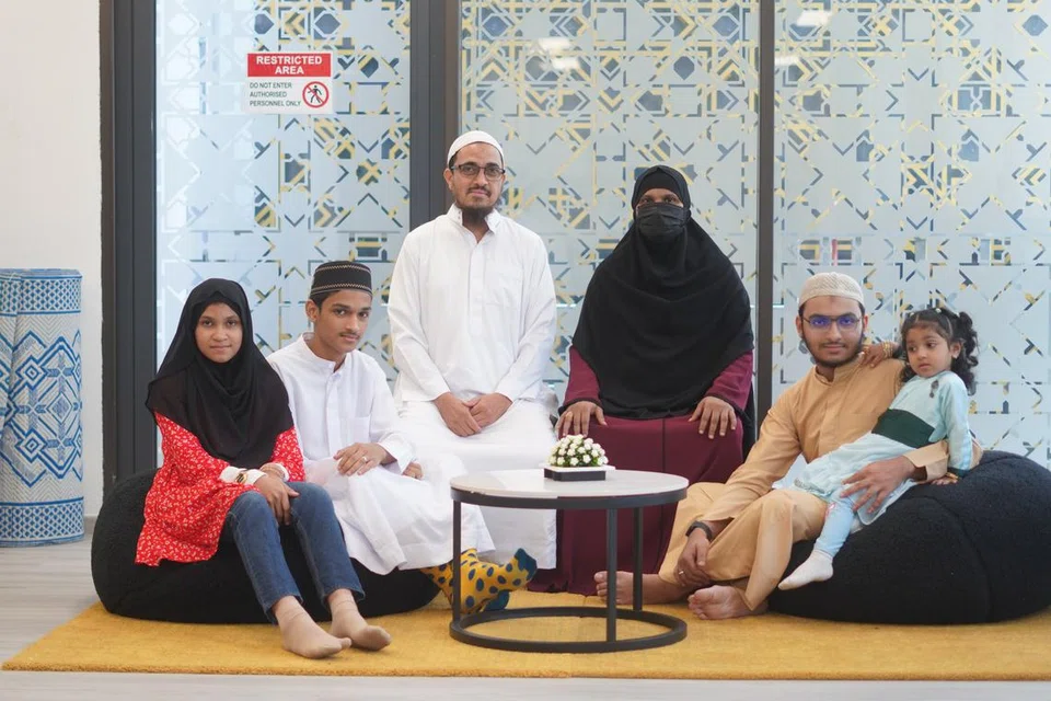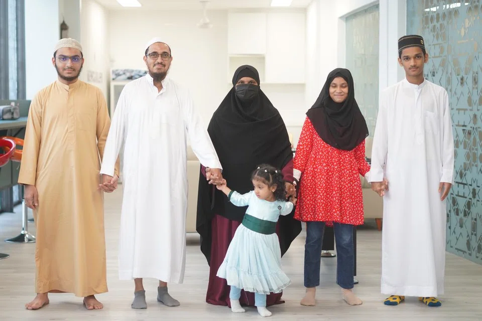 (இடமிருந்து) அம்ரா முஹம்மது, அப்துல்லாஹ் முஹம்மது, தந்தை முஹம்மது அஷ்ராஃப், தாயார் தஹீரா பானு, அமார் முஹம்மது, ஆலியா முஹம்மது. - படம்: ஆதர்ஷ் வின்சன்ட்