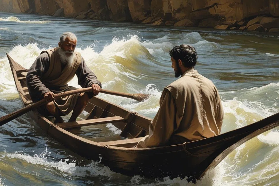 படகு ஆற்றில் மூழ்க, பயத்துடன் தத்தளித்துக்கொண்டு இருந்த அறிவாளியையும் சேர்த்து இழுத்து நீந்தியபடியே கரைக்கு வந்து சேர்ந்தார் படகோட்டி.