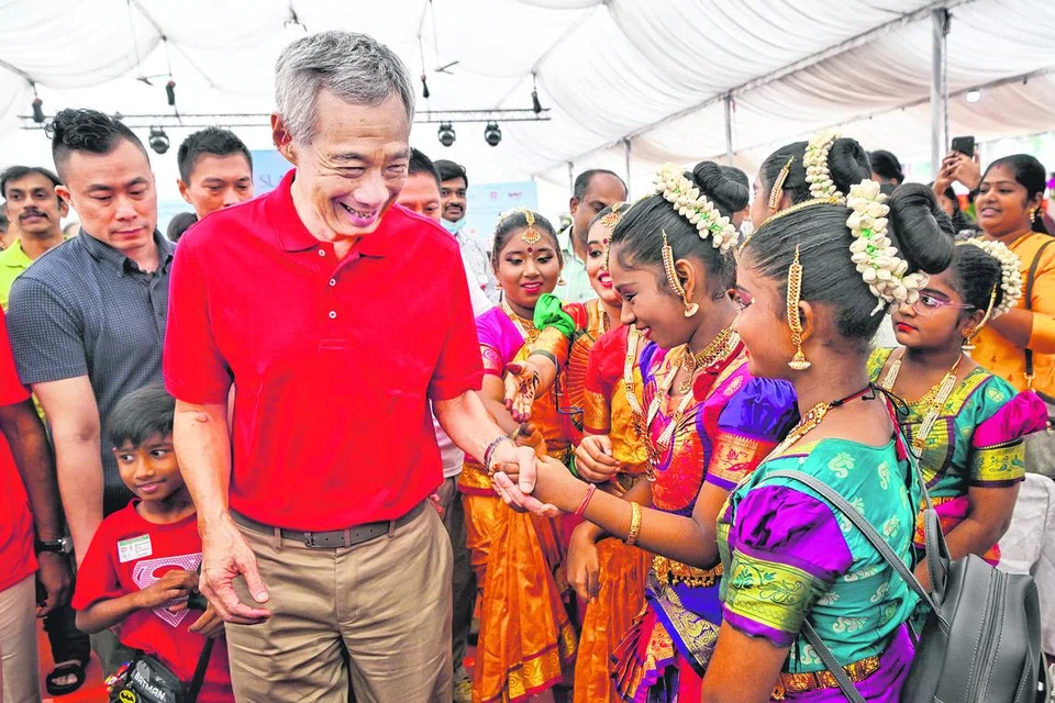 கலை நிகழ்ச்சி படைத்த சிறுமிகளிடம் கைகுலுக்குறார் திரு லீ. - படம்: ஸ்ட்ரெய்ட்ஸ் டைம்ஸ்