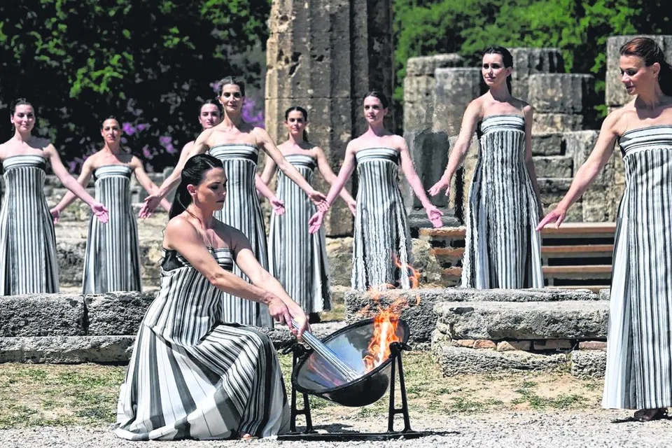 கிரேக்கத்தின் பாரம்பரிய உடையணிந்த நடிகை மேரி மினா சூரிய கடவுளை நோக்கி வணங்கி விட்டு அங்கு சிறிய பானையில் எரிந்துகொண்டிருந்த ஜுவாலையில் தீபத்தை ஏற்றினார்.