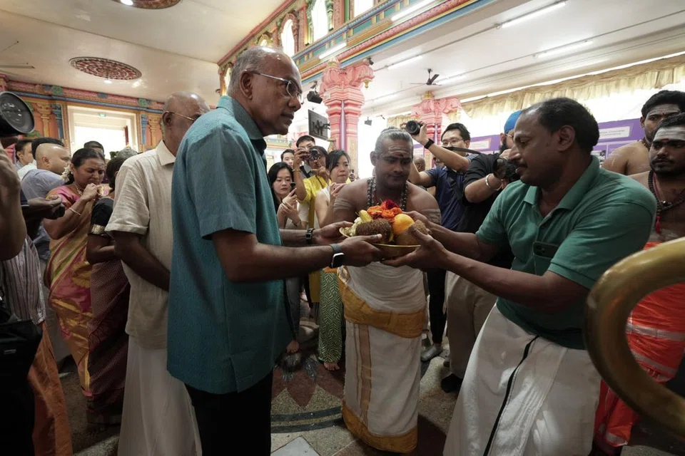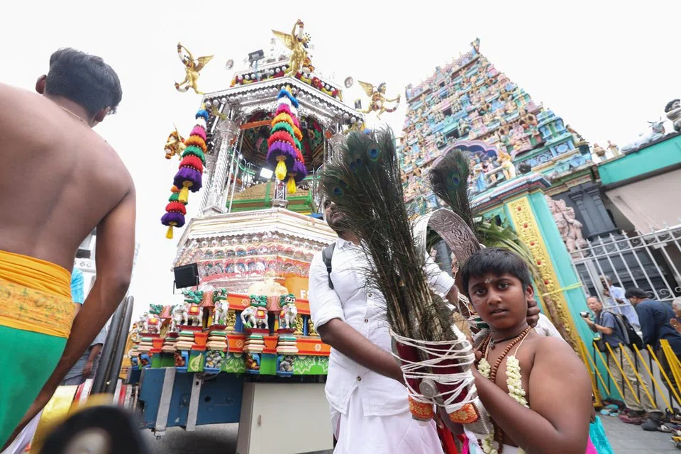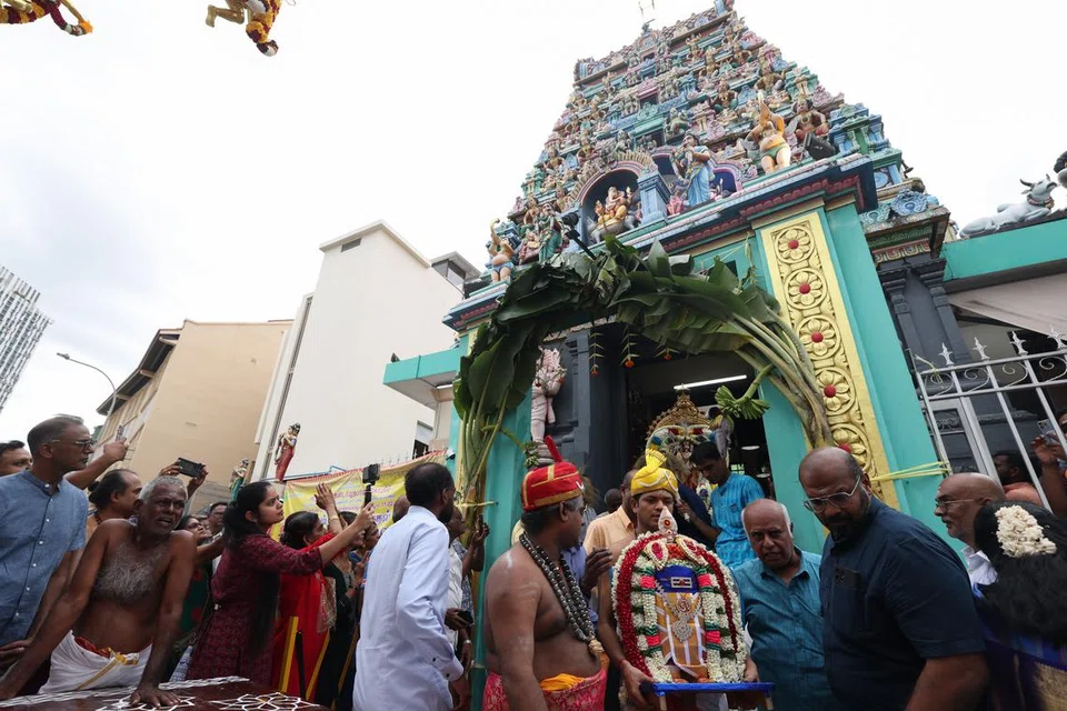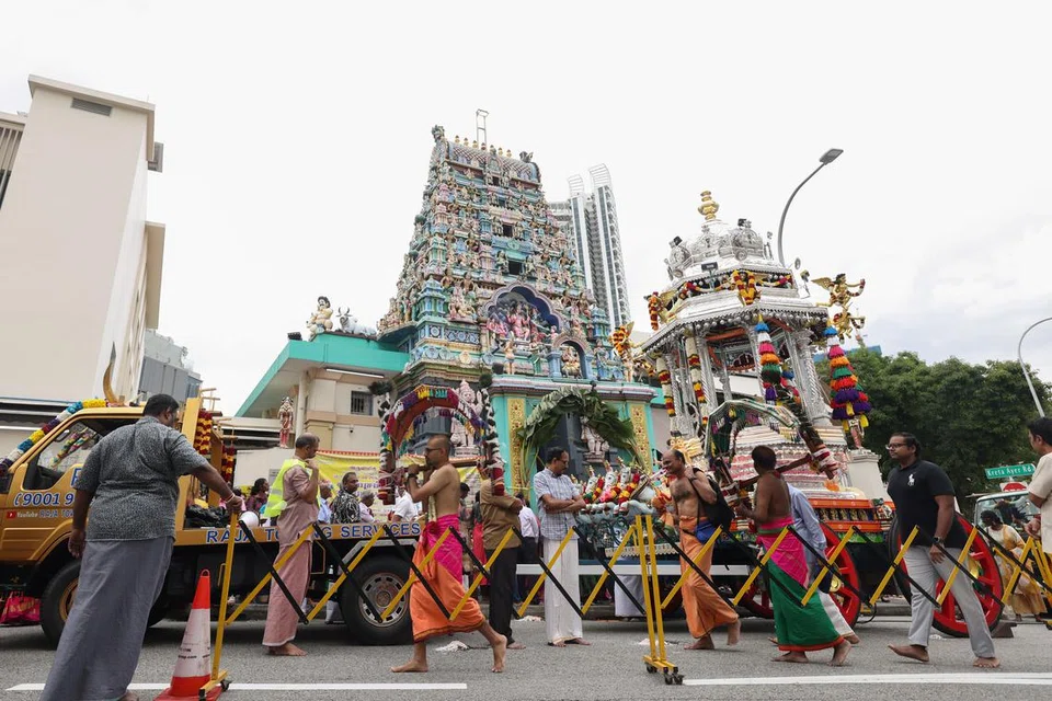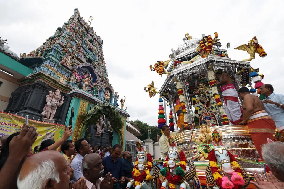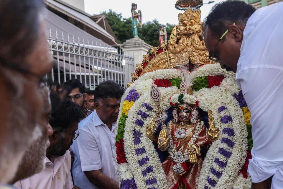 சவுத் பிரிட்ஜ் ரோடு ஸ்ரீ மாரியம்மன் கோயில் வாசலில் நின்ற வெள்ளி ரதம். - படம்: த.கவி