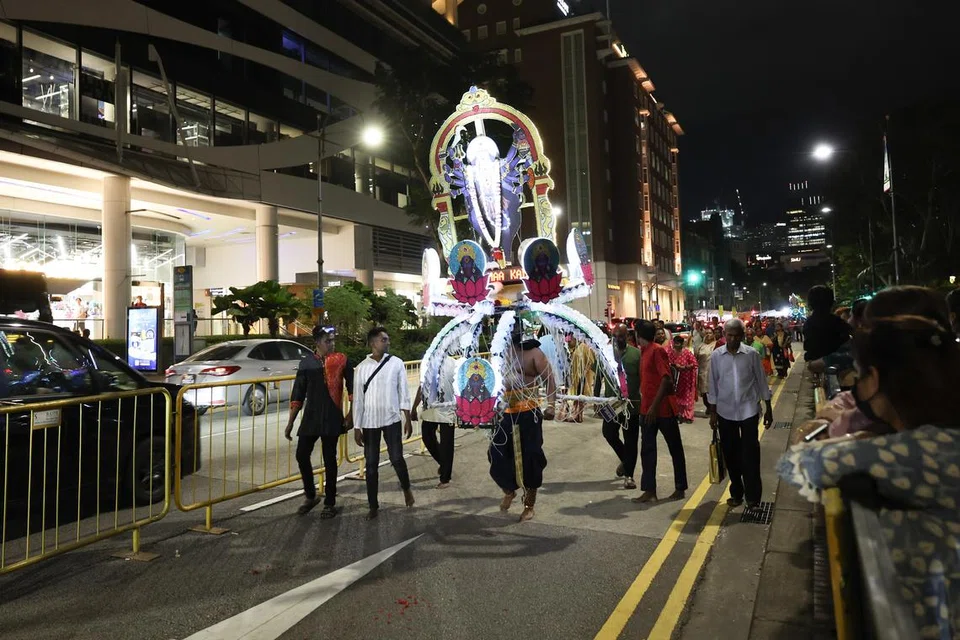 நகர மத்தியில் இரவு நேர காவடி ஊர்வலம். - படம்: சுந்தர நடராஜ்