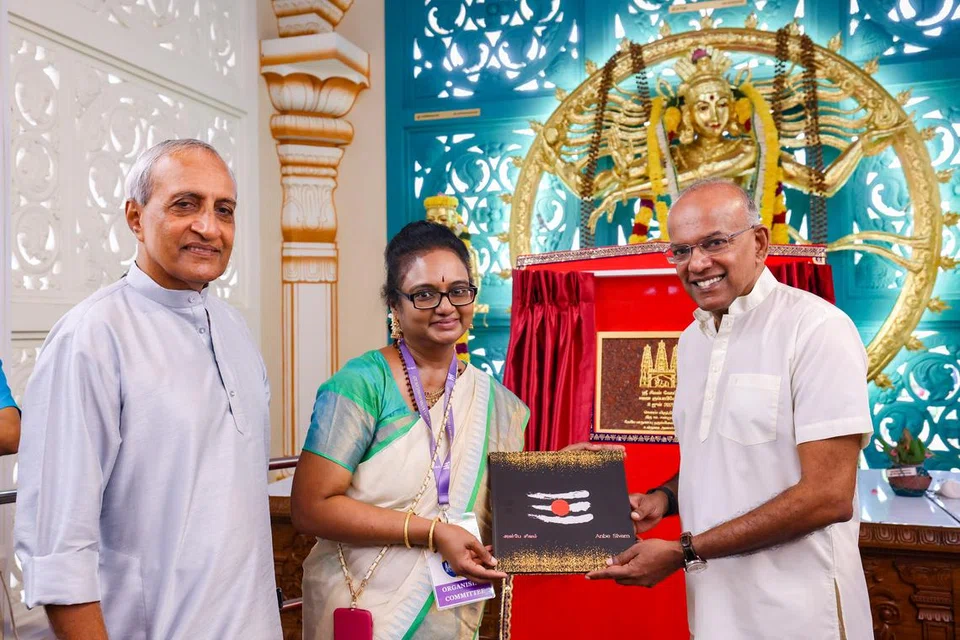 (வலமிருந்து) ஸ்ரீ சிவன் கோயில் நிர்வாகத் தலைவர் யோகநாதன் அம்மையப்பன், இந்து ஆலோசனை மன்றத்தின் தலைவர் க. செங்குட்டுவன், தேசியப் பாதுகாப்பு ஒருங்கிணைப்பு, உள்துறை அமைச்சர் கா சண்முகம், இந்து அறக்கட்டளை வாரியத்தின் தலைவர் ராஜன் கிருஷ்ணன், வாரிய துணைத்தலைவர் சுசிலா கணேசன். திருக்குடமுழுக்கின் நினைவுச்சின்னம் வெளியிடப்படுகிறது. - படம்: த.கவி