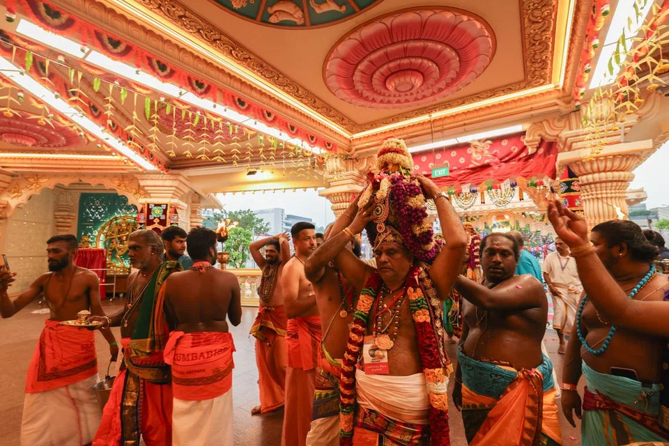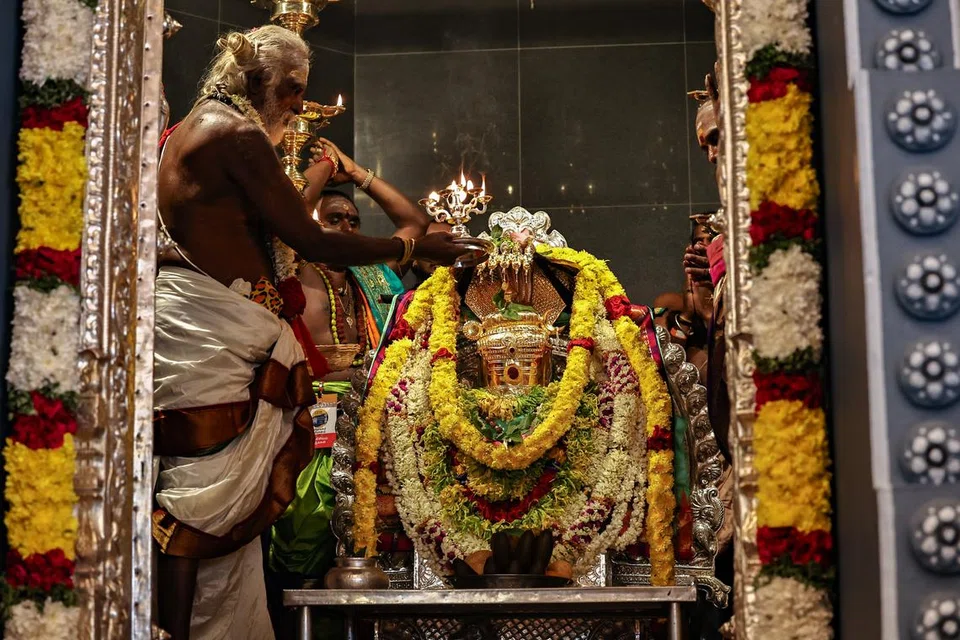 ஆலயத்தின் தலைமை அர்ச்சகர் ஸ்ரீ மீனாக்ஷி சுந்தர சிவாச்சாரியார் அலங்கரிக்கப்பட்ட கடத்தைச் சுமந்து மூலவர் சந்நிதிக்குச் செல்கிறார். - படம்: த.கவி