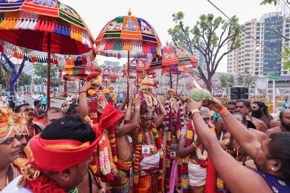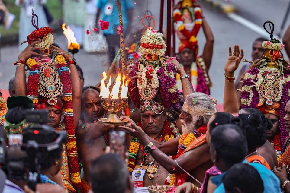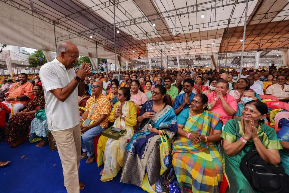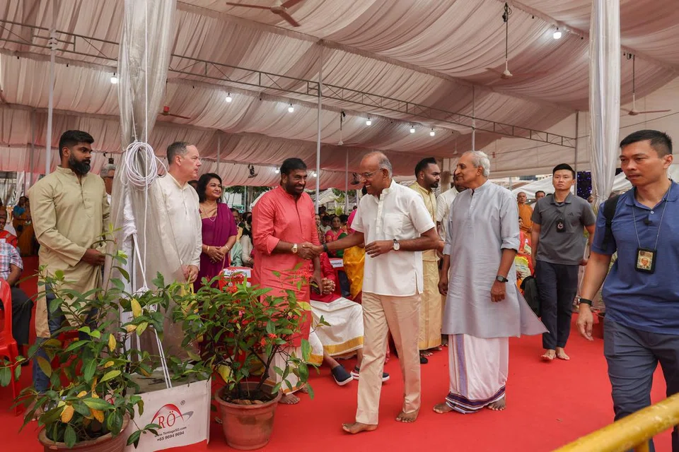 தேசியப் பாதுகாப்பு ஒருங்கிணைப்பு, உள்துறை அமைச்சர் கா சண்முகம் (இடது) பக்தர்களுக்கு வணக்கம் தெரிவிக்கிறார். - படம்: த.கவி