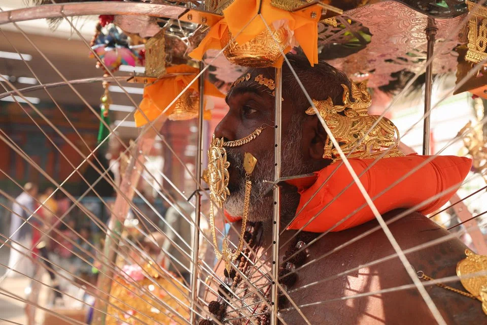 பால்குடத்தை ஏந்திக்கொண்டு, உடல் முழுவதும் அபிஷேகப் பொருள்கள் நிறைந்த சிறு குடங்களைக் குத்தி இணைத்தவாறு பக்தர் ஒருவர் வேண்டுதல் செலுத்துகிறார். - படம்: த.கவி