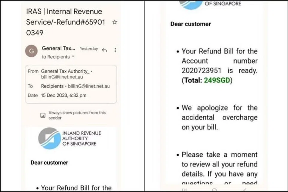 அவர்கள் சிங்கப்பூர் உள்நாட்டு வருவாய் ஆணையம் அனுப்புவது போன்று போலி மின்னஞ்சல் ஒன்றை பாதிக்கப்பட்டவர்களுக்கு அனுப்புவார்கள் எனக் காவல்துறை தெரிவித்தது.