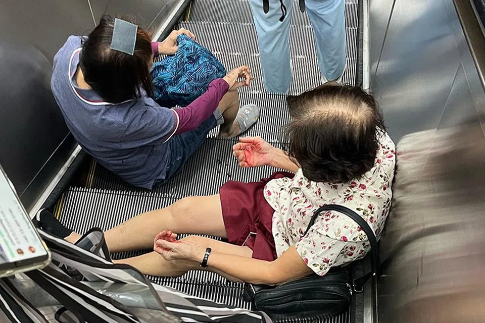 மதர்ஷிப் வாசகர் பகிர்ந்துகொண்ட படம் ஒன்றில், இரண்டு பெண்கள் மின்படிக்கட்டில் அமர்ந்திருந்ததையும் அவர்களில் ஒருவரின் கைகளில் ரத்தம் கசிந்ததையும் காணமுடிந்தது.