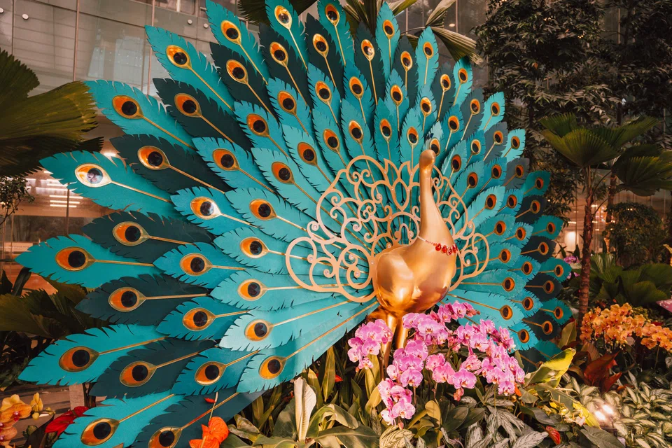 சாங்கி விமான நிலையத்தில் பேரழகுடன் காட்சிதரும் மயில். - படம்: சாங்கி விமான நிலையக் குழுமம்