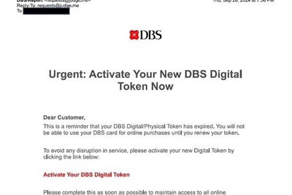 பாதிக்கப்பட்டவர்கள் டிபிஎஸ் வங்கியிலிருந்து ஒரு மின்னஞ்சல் அல்லது குறுஞ்செய்தியைப் பெறுவார்கள். தங்கள் வங்கிக் கணக்குகள் அல்லது மின்னிலக்க அடையாள வில்லை தொடர்பான அவசர சிக்கலைத் தீர்க்க உட்பொதிக்கப்பட்ட இணைய இணைப்பை சொடுக்கு போடும்படி அவர்கள் வலியுறுத்தப்படுவார்கள்.