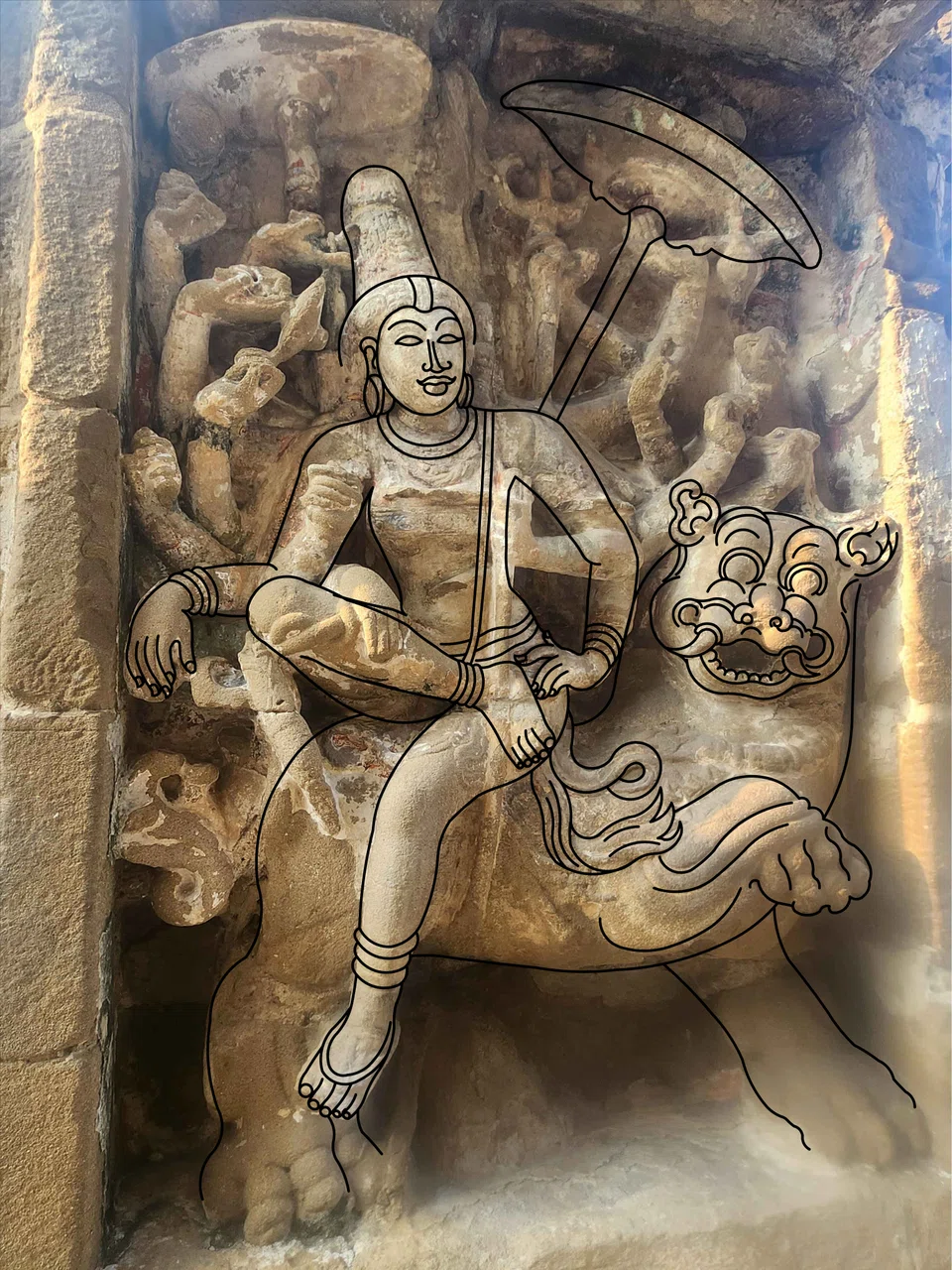 பதினாறு கரங்களுடன் சிம்ம வாகனத்தில் அமர்ந்திருக்கும் கோலத்தில் செதுக்கப்பட்டுள்ள சிலை மேலோட்டமான பார்வைக்கு இந்துத் தெய்வமான அன்னை லலிதா பரமேஸ்வரியாகக் காட்சியளிக்கிறது. அதை உற்றுநோக்கினால், மன்னர் இராஜசிம்ம பல்லவன் தன் உருவத்தை அதில் ஒளித்துச் செதுக்க வைத்திருக்கிறார் என்பதை விளக்குகிறார் நூலாசிரியர்.