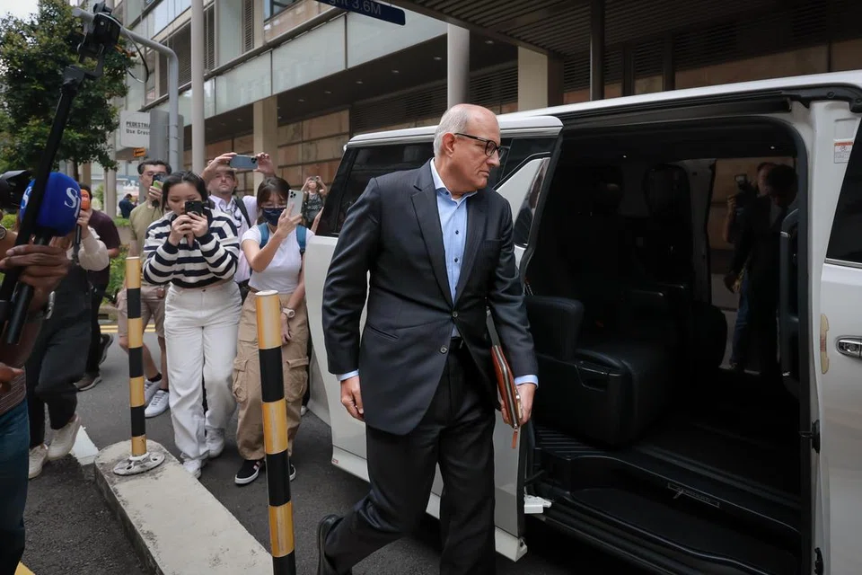 உயர் நீதிமன்றத்திலிருந்து காலை 11.35 மணியளவில் புறப்பட்ட முன்னாள் போக்குவரத்து அமைச்சர் எஸ்.ஈஸ்வரன். - படம்: ஸ்ட்ரெய்ட்ஸ் டைம்ஸ்