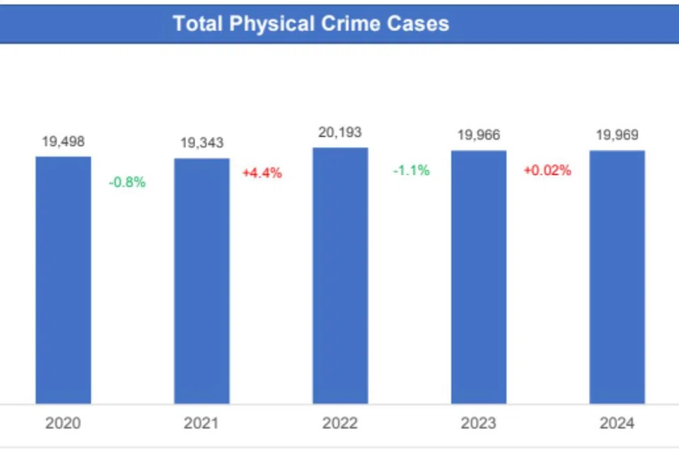 நேரில் நடக்கும் குற்றங்களின் (இணையக் குற்றங்களை உள்ளடக்காதவை) எண்ணிக்கை 2023ல் 19,966ஆக இருந்தது. 2024ல் அந்த எண்ணிக்கை 19,969ஆக சிறிது கூடியது.