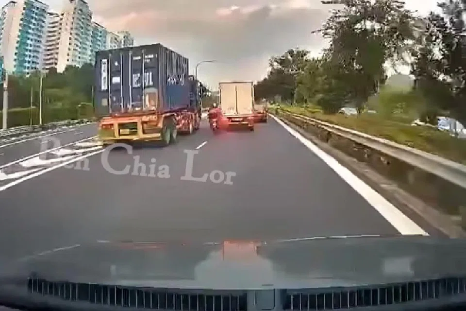 சாலையின் முதல் தடத்தில் சென்றுகொண்டிருந்த லாரி இடது பக்கம் இருந்த தடத்துக்கு மாற முற்பட்டபோது அவ்வழியாகச் சென்றுகொண்டிருந்த மோட்டார் சைக்கிள் மீது அது மோதியது.