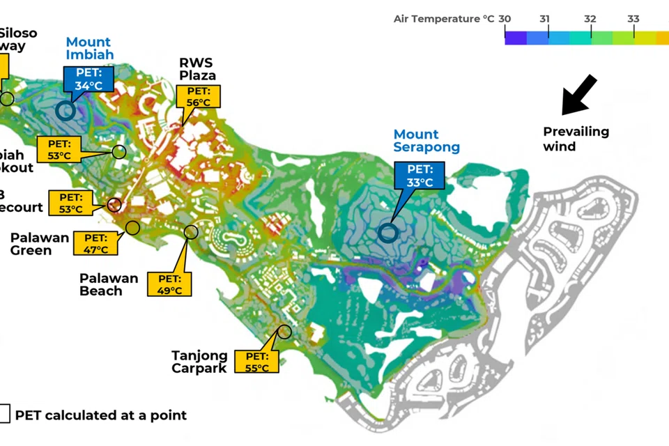 பசுமை, துளைகளுடன் கூடிய கட்டட வடிவமைப்பு, காற்றோட்டத் தடங்கள் ஆகியவை தீவை இயற்கையாகக் குளிர்விப்பதில் முக்கியப் பங்கு வகிப்பதை அதன் முடிவுகள் சுட்டிக்காட்டின. இதற்கேற்றவாறு, செந்தோசா சென்சரிஸ்கேப் போன்ற முக்கியச் சின்னங்கள், நிழற்பாதைகள், உயர்த்தப்பட்ட மேடைகள், மெதுவாகச் சுழலும் மிகப் பெரிய மின்விசிறிகள் (High-volume low-speed fan), பசுமை வளங்கள் ஆகியவற்றை அவை ஏற்கனவே ஒருங்கிணைத்துள்ளன.