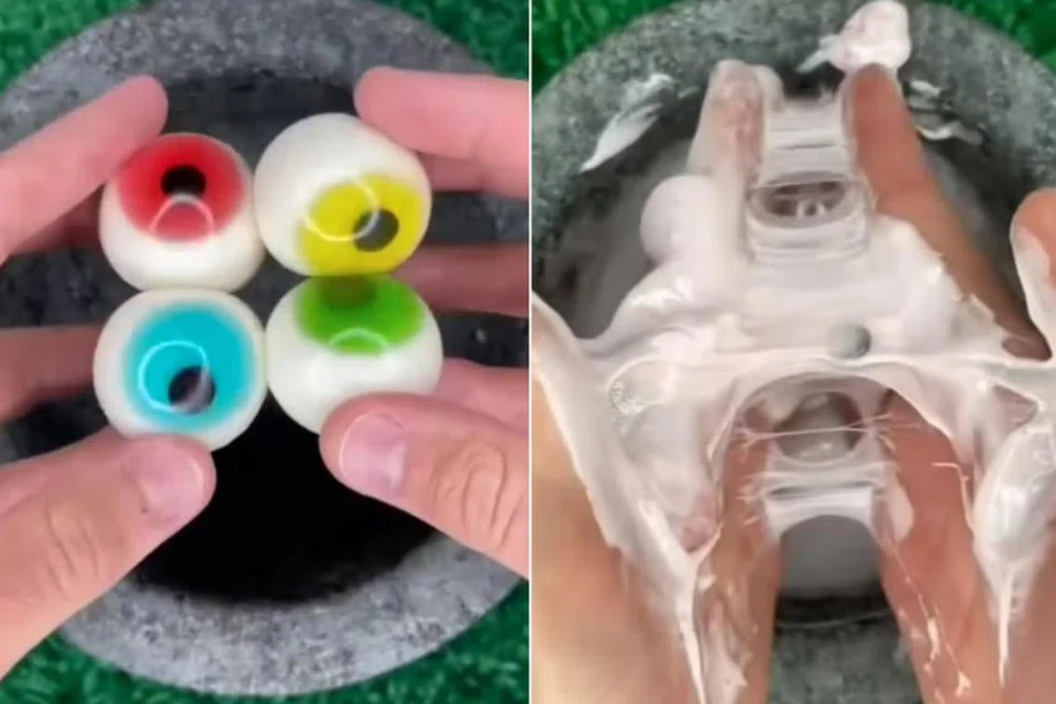 கண்ணைப் போன்ற தோற்றமுடைய ஜவ்வு மிட்டாயை நசுக்கியபோது அது பசை போன்று மாறியது. - படம்:மலேசிய பொதுச் சுகாதாரம்/ ஃபேஸ்புக்