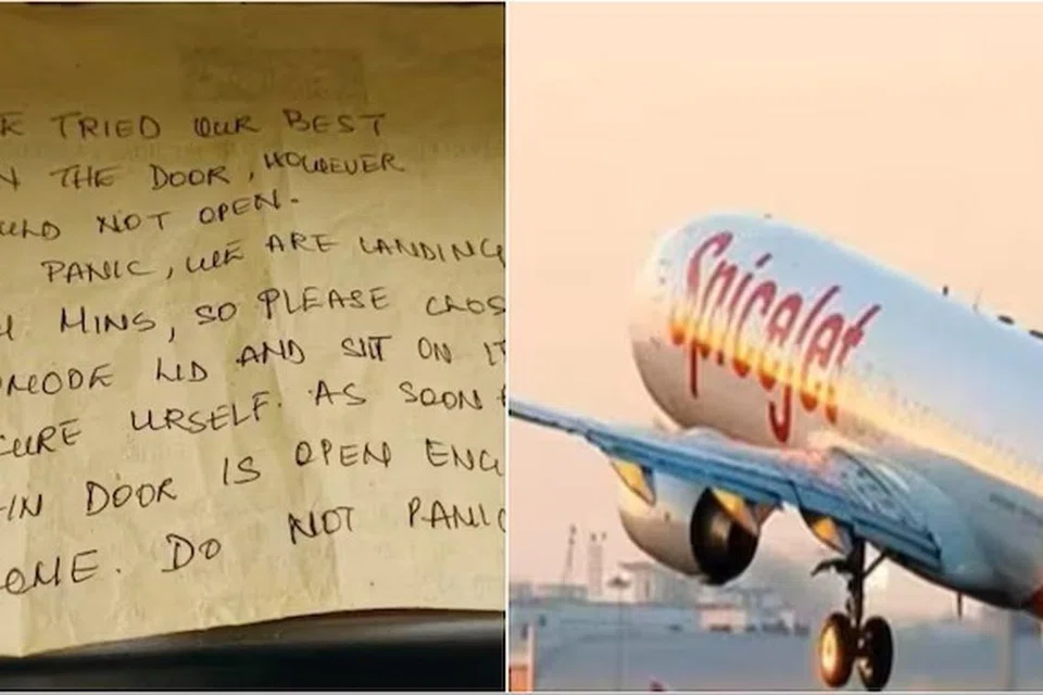 கழிவறைக் கதவைத் திறக்க முடியாமல் போனதையடுத்து, ‘பீதியடைய வேண்டாம்’ எனக் குறிப்பிட்டு, விமானப் பணியாளர்கள் ஒரு துண்டுச்சீட்டைக் கதவிடுக்கு வழியாகச் செருகினர்.