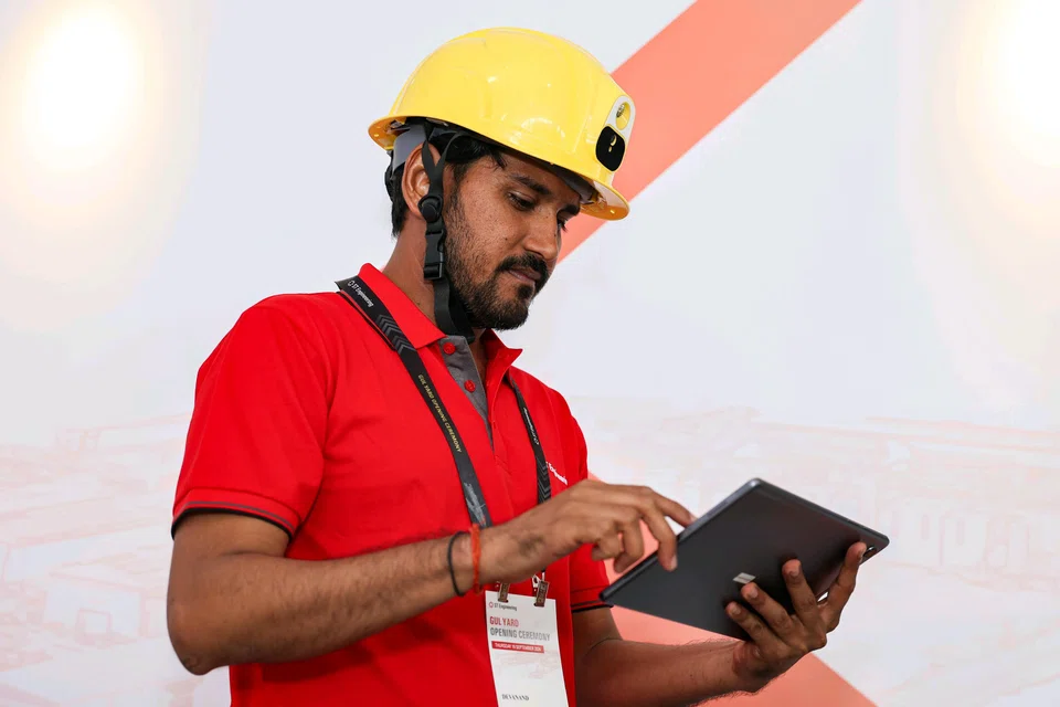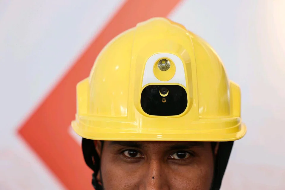 42 வயதான எஸ்டி இன்ஜினியரிங் மூத்த மேற்பார்வையாளர் தேவானந்த் யாதவ், செப்டம்பர் 18 அன்று, கல் கப்பல் கட்டும் தளத்தில் அறிவார்ந்த தலைக்கவசத்தைக் காட்சிப்படுத்துகிறார். - படம்: ஸ்ட்ரெய்ட்ஸ் டைம்ஸ்