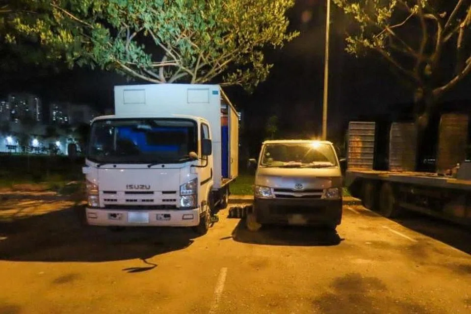 ஒரு வாகனத்திலிருந்து இன்னொரு வாகனத்துக்குக் கருப்பு குப்பைப் பைகளை ஆடவர்கள் மாற்றுவதை அதிகாரிகள் கண்காணித்தனர்.
