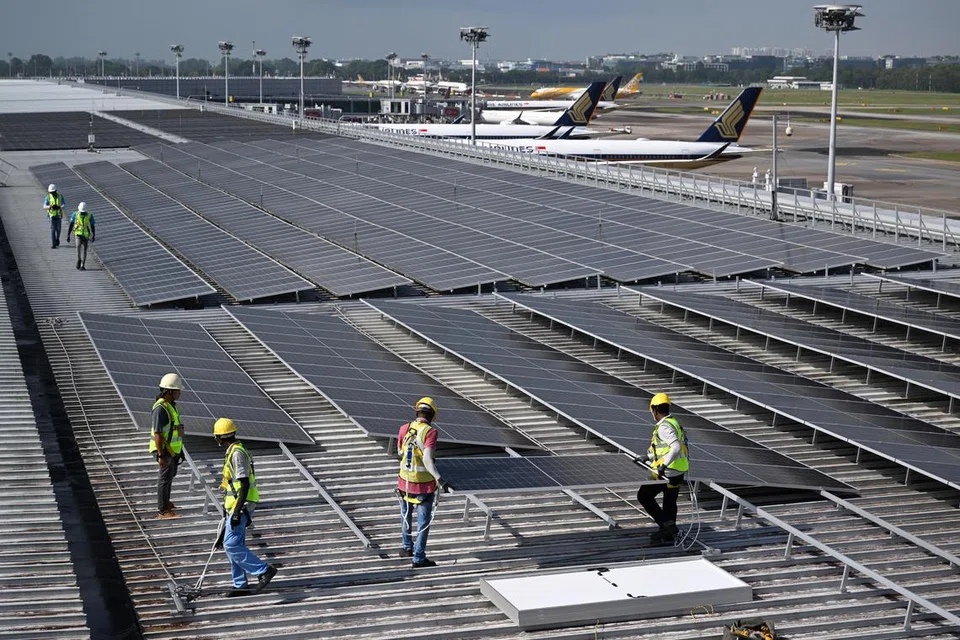 சாங்கி விமான நிலையத்தின் பயணிகள் முனையக் கட்டடங்களின் கூரைகள், விமானங்கள் புறப்படவும் தரையிறங்கவும் ஒதுக்கப்பட்டுள்ள வான்வெளிக்களம், சரக்குக்கிடங்குகள் ஆகியவற்றில் சூரியசக்தித் தகடுகள் பொருத்தப்படுகின்றன.