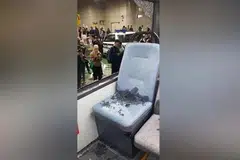இதில் பேருந்தின் முன்பகுதி சேதமுற்றது. பேருந்திலிருந்து அதன் முன்கண்ணாடி அகன்றது. அதன் கண்ணாடித் துகள்கள் தரையில் சிதறிக் கிடந்தன.