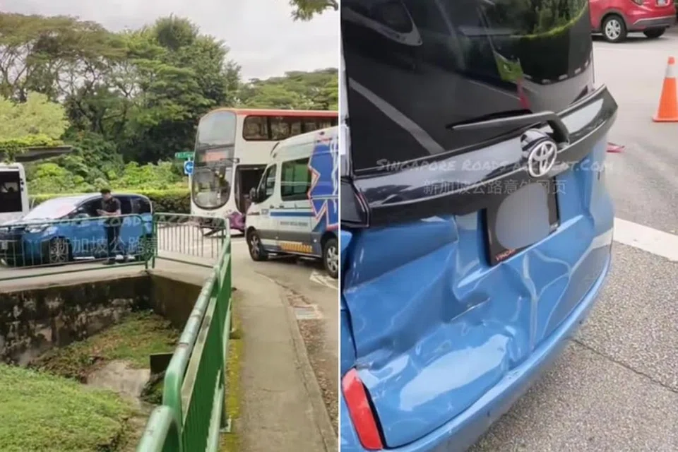 காரின் 34 வயது பெண் ஓட்டுநர் சுயநினைவுடன் இருந்தார். - படம்: சிங்கப்பூர்ரோட்ஸ்ஆக்சிடெண்ட்.காம்/ ஃபேஸ்புக்