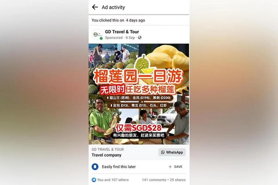 ஃபேஸ்புக்கில் ‘ஜிடி டிராவல்ஸ் & டூர்ஸ்’ என்ற பயண நிறுவனம், ஃபேஸ்புக்கில் வெளியிட்ட ‘மலேசியாவின் கூலாய்க்கு $28 டுரியான் பகல்நேரச் சுற்றுப்பயணம்’ என்னும் விளம்பரத்தை நம்பி திருவாட்டி லை, 54, என்ற அப்பெண்மணி அந்நிறுவனத்தைத் தொடர்புகொண்டார்.