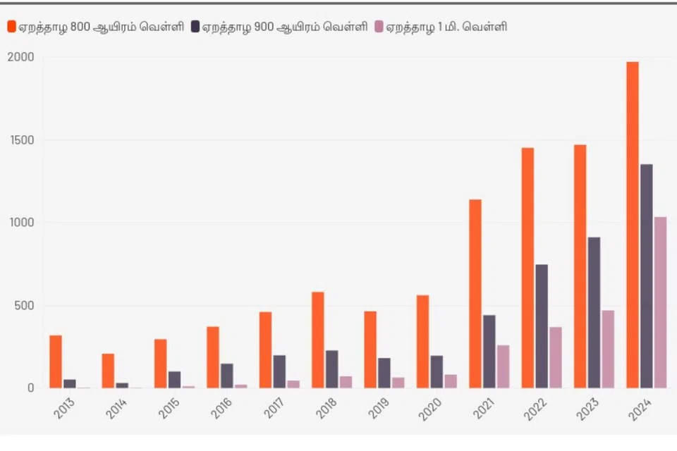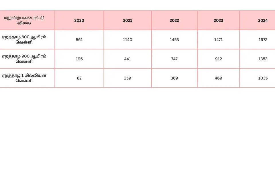 ஏறத்தாழ 900,000 வெள்ளிக்கும் அதிகமாக விலையில் விற்கப்பட்ட வீடுகளின் எண்ணிக்கை, கடந்தாண்டு 1,353 ஆக உள்ளது. இந்த எண்ணிக்கை, 2023ல் 912ஆக இருந்தது.