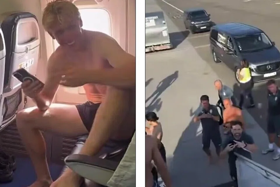 விளையாட்டு வீரர்கள் நீச்சல் குளத்திலிருந்து வருவது போல் விமானத்திலிருந்து அரை நிர்வாணமாக வெளியேறினர்.