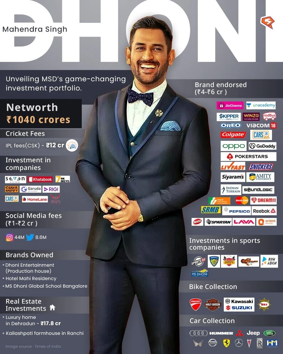 டோனியின் சொத்து மதிப்பு ரூ.1,040 கோடி (S$170 மில்லியன்) என்கிறது ‘ஸ்டாக் குரோ’ அறிக்கை.